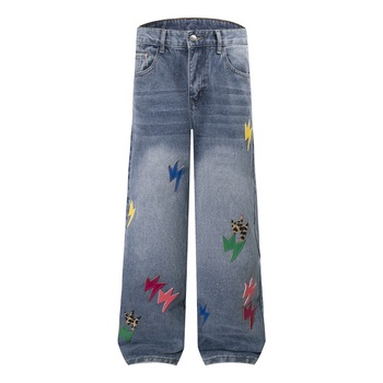Pantalones de mezclilla de hombre llamativos cómodos rectos versátiles calle azul retro símbolo relámpago de cuero apilable tobillo personalizado