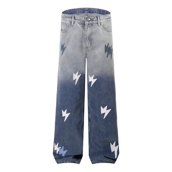 Compradores Gradiente personalizado Retro Azul Cuero relámpago Símbolo Lavado Calle Tendencia Juvenil Versátil Pierna recta Pantalones de mezclilla para hombres