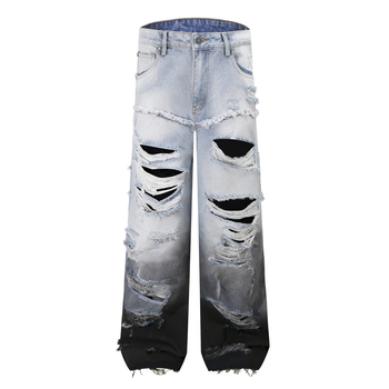 Xu hướng thời trang đường phố dần dần thay đổi màu sắc quần jean nam lỏng ống thẳng đàn hồi Màu Xanh Tua Rua quần denim giặt